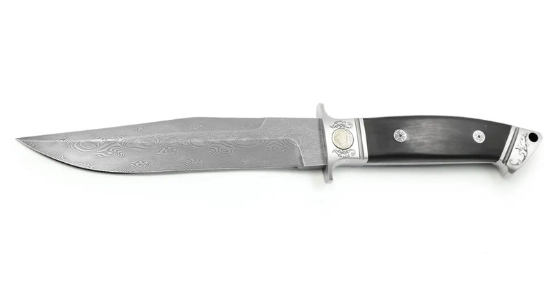 The "Defender" model was originally designed in the 1990s by Richard Hehn, one of Germany's most renowned knifemakers. Now, we have reissued this coveted knife as a special edition limited to just 100 pieces. The blade is crafted from rust-resistant SuperClean® Balbach Damascus steel and hardened to 60 HRC. For the handle scales, we have chosen robust buffalo horn and the exceptionally elegant ivory substitute "Elforyn® Super Tusk." Both versions are limited to 50 pieces each. Finely ornamented engravings on the pommel and bolster lend this handcrafted collector's knife an additional touch of elegance. It comes in a high-quality wooden gift box, complete with a black saddle leather sheath and certificate.