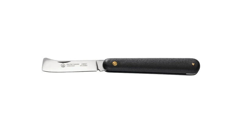The PUMA budding knife is a specialized cutting tool used professionally in horticulture, nurseries, and home gardens for grafting plants. The folding blade features an exceptionally sharp edge and a "tongue" at the front of the blade spine, which acts as a bark remover. Budding involves inserting a bud from a scion into a rootstock. The blade tip is therefore adapted to different plant types. The knife is ideal for working with fruit trees or roses, and also for scoring or peeling bark. With its stainless steel blade and durable ABS plastic handle, the PUMA budding knife is the perfect cutting tool for precise grafting work.