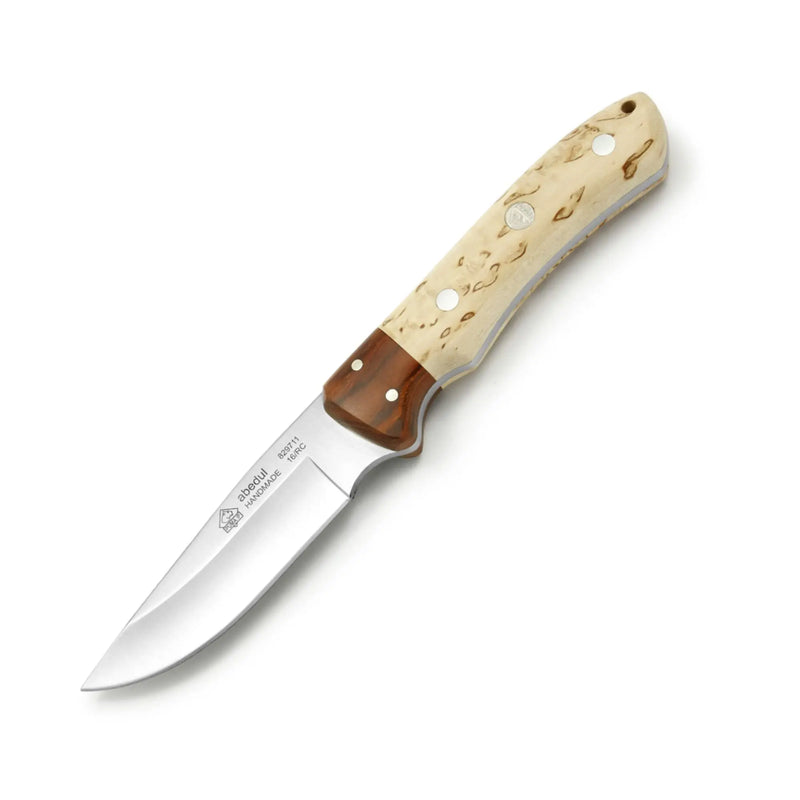 All knife models in the PUMA IP (International Production) line are high-quality products created in collaboration between PUMA Solingen and renowned partner manufacturers in Spain. These handcrafted knives are typically fitted with handles made from natural materials such as staghorn and Mediterranean woods (e.g., olive), and sometimes from durable plastics. The steel types are selected according to the intended use of each knife. The PUMA IP abedul model is a handy hunting and outdoor knife made of AN.58 stainless steel with cocobolo bolsters and birch wood handle scales. It comes with a brown saddle leather sheath.