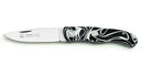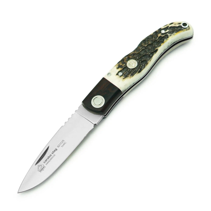 The Carabo Stag knife is a visual highlight with its staghorn handle scales combined with grenadilla wood bolsters. The blade is secured with a midlock mechanism. Beautiful and functional at the same time.