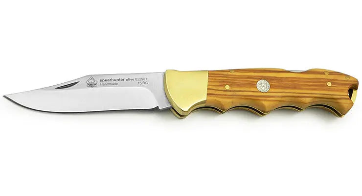 All knife models in the PUMA IP (International Production) line are high-quality products created in collaboration between PUMA Solingen and renowned partner manufacturers in Spain. These handcrafted knives are typically fitted with handles made from natural materials such as staghorn and Mediterranean woods (e.g., olive), and sometimes from durable plastics. The steel grade is selected according to the intended use of each knife. The PUMA IP spearthunter olive model is a robust, strong folding knife with a locking spearpoint blade made of 1.4116 stainless steel. The handle features brass bolsters and olive wood scales.