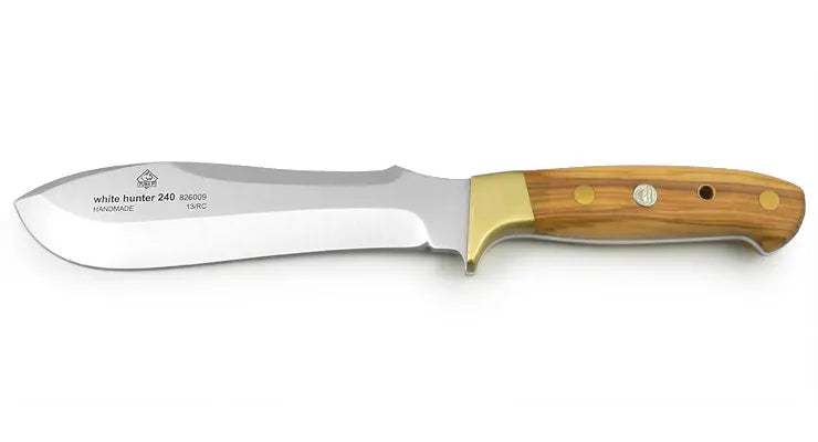 All knife models in the PUMA IP (International Production) line are high-quality products created in collaboration between PUMA Solingen and renowned partner manufacturers in Spain. These handcrafted knives are typically fitted with handles made from natural materials such as staghorn and Mediterranean woods (e.g., olive), and sometimes from durable plastics. The steel types are selected according to the intended use of each knife. Based on the original PUMA White Hunter model, and incorporating new ergonomic insights, the PUMA IP White Hunter 240 Olive, featuring olive wood scales, was developed. This model offers hunting and outdoor enthusiasts a traditional blade shape in a modern design.