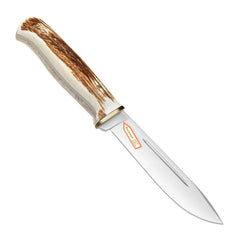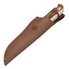 The PUMA SGB hunter's friend is a classic knife that we first introduced in the 1950s. This beautiful drop-point design has proven itself as a reliable knife blade. The tip is lightly sharpened, the blade length is 119 mm, and it features a blood groove. The satin-finished blade is made of 4 mm thick 1.4116 German high-performance steel and has a Rockwell hardness of 55-57 HRC. This is a classic knife suitable for all kinds of outdoor activities: hunting, fishing, camping, and bushcraft. The hunter's friend also features staghorn handles, a finger guard, and brass pins. A high-quality leather sheath is included.