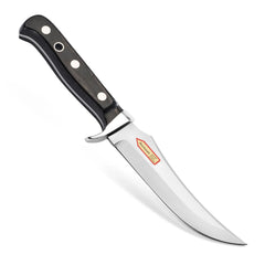 The tip of the skinning blade, typical for skinning, is positioned slightly above the spine of this Solingen classic. This makes the cutting edge very curved at the front, effectively lengthening it. This has the advantage of allowing for significantly longer cuts and reducing the need to reposition the knife. Because the blade tip is positioned so high, the risk of accidentally piercing the valuable hide is also considerably minimized. The full tang is fitted with warp-resistant Pakkawood scales and a reliable aluminum finger guard.