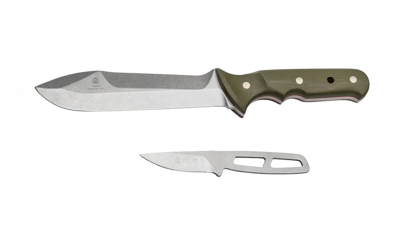 We now offer the Frischling and Keiler models with a combination leather sheath, so you can always carry both knives securely on your belt or gear. The small PUMA Frischling is a perfect backup knife and also masters delicate cutting tasks. Its skeletonized construction makes it lightweight and easy to handle. The large PUMA Keiler is perfect for bushcraft or outdoor activities; demanding tasks like chopping wood, gutting game, or cutting thick materials are no problem for its robust blade. The G10 handle provides a secure grip. The accompanying high-quality combination saddle leather sheath reliably holds the PUMA HUNT TO SURVIVE hunting knife. What's your next adventure?
