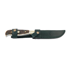 This beautifully shaped, rustic hunting knife features staghorn scales and nickel silver bolsters. The PUMA "waidmann" sits comfortably in the hand and reliably performs all necessary tasks. Thanks to its compact and robust design with a full tang, this high-quality hunting knife is also suitable for outdoor use and as a practical lunch knife. The select staghorn scales are permanently attached with sturdy rivets, giving the "waidmann" exceptional stability. With this practical PUMA knife, hunting becomes a truly special experience.