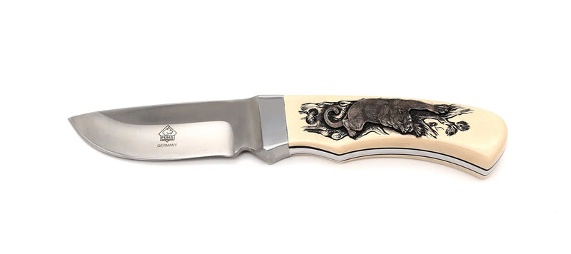Handle: White Micarta with a puma as a silver inlay and decorative scrimshaw. The reverse side features oak leaves as scrimshaw.