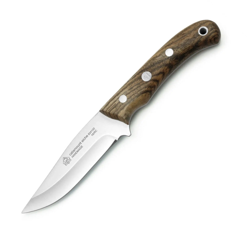 Unser PUMA IP catamount eiche ist ein echter Allrounder. Die Klingenform macht dieses Messer zum Alleskönner. Die Basis der Klinge ist breit und robust genug um große Stücke aufzubrechen, während die schmal zulaufende Klingenspitze sogar das Ringeln ermöglicht und zudem für die gute Führigkeit des Messers sorgt. Mit einer Härte von bis zu 60 Rockwell bleibt die Werksschärfe der Klinge länger erhalten als bei weicheren Stahlsorten. Eine ausgeprägte Fingermulde am Übergang zum Griff des Messers gewährleistet sicheren Halt. Für den Griff dieses Messer haben wir langlebiges Eichenholz gewählt und es in eine ergonomische Form gebracht um stark zupacken zu können. Am Ende des Griffes ist eine Fangriemenöse eingearbeitet um ein Lederband oder ähnliches anbringen zu können. All das macht dieses Messer zu einem soliden und hochwertigen Praktiker ohne Schnickschnack.