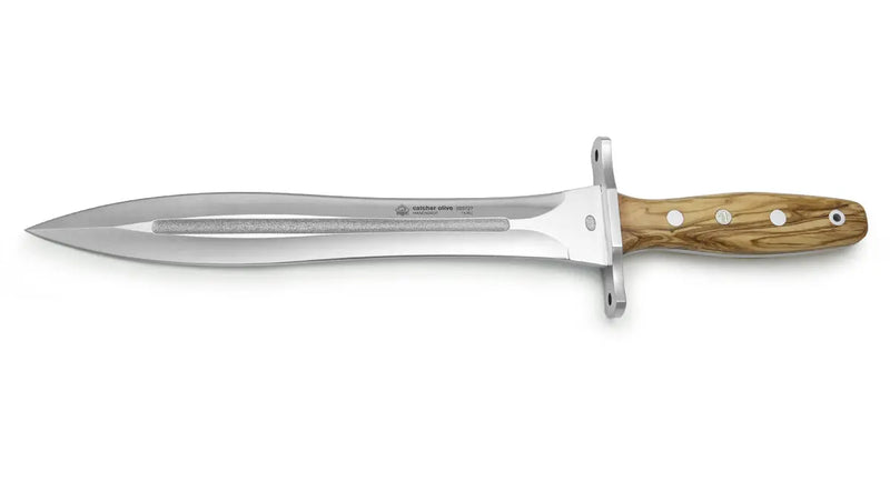 Die PUMA IP catcher Serie besteht aus drei robusten Abfangmessern.Im Fokus dieser Serie steht die absolute Praxistauglichkeit. Daher verfügt jedes der drei Messer über eine zweischneidige Klinge mit einer massiven, breiten Klingenspitze und einer Blutrinne. Besonders ausgeprägte Knebel sorgen für Sicherheit beim kraftvollen Einsatz. Die Griffe aus Hirschhorn oder Olivenholz sind griffig und pflegeleicht. Getragen werden die Messer in einer Scheide aus derbem Sattelleder, in welcher sie mit einem Riemen und Druckknopf gesichert werden.