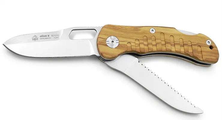 Alle Messermodelle der Markenlinie PUMA IP (Internationale Produktion) sind hochwertige Erzeugnisse, die in Zusammenarbeit von PUMA Solingen mit Partnermanufakturen in Spanien entstehen. Die dort für uns in Handarbeit gefertigten Schneidwerkzeuge werden meistens mit Griffschalen aus Naturprodukten, wie Hirschhorn und mediterranen Hölzern (z.B. Olive), manchmal auch aus unempfindlichen Kunststoffen, versehen. Die Stahlsorten werden dem Verwendungszweck des jeweiligen Messers entsprechend ausgewählt. Das Modell PUMA IP olive II wurde für den praxisorientierten Jäger konstruiert, besitzt zwei Klingen aus 440A-Stahl und trägt Olivenholz-Griffschalen.