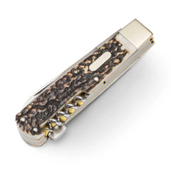 Jeder Jäger sollte zumindest ein Jagdtaschenmesser besitzen. Es dient nicht nur zum Versorgen des erlegten Wildes, sondern ist auch ein notwendiges Schneidwerkzeug für andere Verrichtungen im Revier. Das PUMA „jagdtaschenmesser 3-teilig“ ist ein handgefertigtes Modell aus Solinger Produktion mit per Rückenfederverriegelung feststellbarer Hauptklinge aus deutschem Qualitätsstahl nach DIN 1.4110, einer Säge und Korkenzieher. Der Griffkörper trägt Backen aus Neusilber und Hirschhornschalen mit eingelassener Gravurplatte. Alle Teile dieses klassischen Jagdtaschenmessers sind rostfrei und sorgfältigst montiert. Wer sich einmal für ein handgefertigtes Jagdtaschenmesser von PUMA entschieden hat, kann ein Leben lang Freude daran haben.