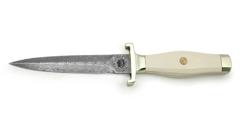 Das PUMA Messer des Jahres 2018, designed von h.p. knoop, verbindet nordische Mythologie mit traditioneller Handwerkskunst. „Der Gott Odin nahm sein Auge heraus und setzte es in den Brunnen der Weisheit und konnte dann sehen, was in der Welt passiert war.“ So heißt es in der Beschreibung des Damaststahls “Odins Eye“, aus der die Klinge des PUMA Messers hergestellt wurde. Kombiniert ist die Klinge mit Griffschalen aus weißem Micarta und Backen aus Neusilber. Auf einer Seite der Griffschalen ist ein Smaragd eingefasst, er symbolisiert das Auge Odins.