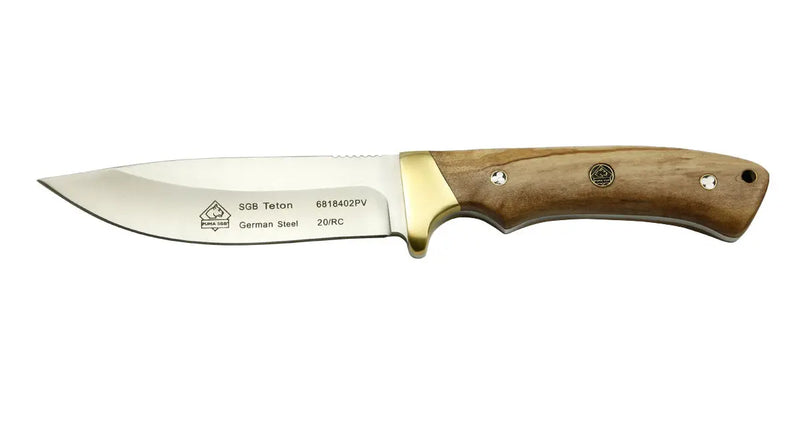 Das Puma SGB Teton verfügt über ein Drop-Point-Klinge und hat eine Gesamtlänge von 239 mm bei einem Gewicht von 198 g. Die satinierte Klinge besteht aus 1.4116 deutschem Hochleistungsstahl mit einer Rockwell-Härte von 55-57 HRC.