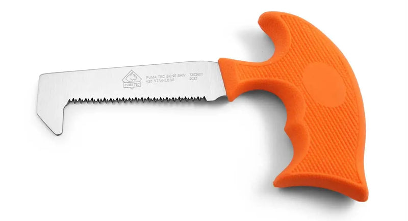 Unsere Knochen- und Aufbruchsäge ist ein hilfreiches Werkzeug für Jäger. Der ergonomische und rutschfeste Kunststoffgriff wurde quer zum Sägeblatt angebracht und erlaubt ein bequemes Arbeiten beim jagdlichen Einsatz. Die abgerundete Spitze des aus dem rostfreien Stahl AISI 420 gefertigten Sägeblatts verhindert Beschädigungen von Organen beim Sägen. Die auffällige, orange Farbgebung schützt vor Verlust im Wald. Zum Lieferumfang gehört ein schwarzes Nylon-Etui mit Gürtelschlaufe.