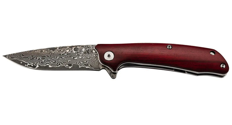 Bei diesem tollen Damast Einhandmesser aus der TEC Serie von Puma bleiben keine Wünsche offen. Die Drop Point Klinge verfügt über eine Kernlage aus rostfreiem 8Cr13 Stahl, auf welche beidseitig je 33-Lagen Damast Stahl aufgeschmiedet werden. Ein Flipper und die kugelgelagerte Klingenachse ermöglichen ein spielend leichtes Öffnen der Klinge. Die Arretierung der Klinge erfolgt durch einen bewährten Liner Lock Mechanismus. Sauber angepasste Heftschalen aus Sandelholz und polierte Edelstahlplatinen bilden den attraktiven Griff. Abgerundet wird die Ausstattung durch eine Fangriemenöse, einen Edelstahl Taschenclip und eine schöne Geschenkbox.