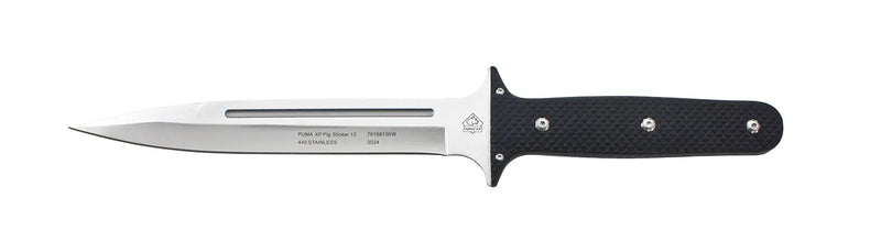 Ein praxistaugliches Abfangmesser ist bei der Jagd auf Schwarzwild schon seit jeher fester Bestandteil der waidmännischen Ausrüstung. Das Modell „pig sticker 13“ aus unserer amerikanischen XP-Serie ist mit seiner knapp 20 cm langen, satinierten Klinge nicht nur funktional, sondern auch optisch ein Hingucker. Der Griff mit integralem Parierelement ist symmetrisch geformt und trägt schöne Schalen aus schwarzem Pakkaholz, das mit einer griffigen Fischhautverschneidung versehen ist. Das Messer besitzt eine durchgehende Fulltangkonstruktion aus einem Stück 440-Stahl, gehärtet auf 55-57 HRC und ist daher sehr stabil. Als spezifisches Merkmal weist die mittelspitze Klinge im Ortbereich eine angeschliffene Phase sowie an den Flanken eine beidseitige Hohlkehle auf. Die Klinge ist nicht beidseitig geschliffen. Unser „PUMA XP pig sticker“ ist auch bestens für die Nachsuche geeignet und wird mit einer sehr hochwertigen, paßgenauen Kydex Scheide mit Beinschlaufe ausgeliefert.
